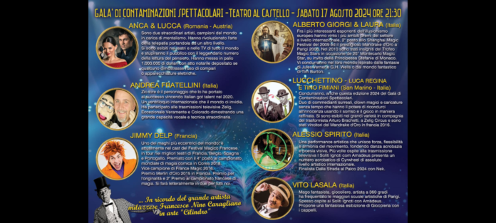 E così nel suggestivo Castello di Milazzo un nuovo straordinario cast darà vita ad un live show memorabile con artisti del calibro di: Vito la sala – Italia (Giocoleria), Alessio Spirito – Italia (Acrobata vincitore “dalla strada al palco 2024”), Jimmy Delp – Francia (2° Premio Campione di Francia), Alberto Giorgi & Laura – Italia (Illusionisti pluripremiati campioni d’Europa 2024), Andrea Fratellini – Italia (ventriloquo vincitore Italia’s Got Talent 2020), I Lucchettino alias Luca Regina & Tino Fimiani (Premio Mandrake d’oro Francia 2016), Anca & Lucca -Austria/Romania (Campioni del mondo in carica di mentalismo).