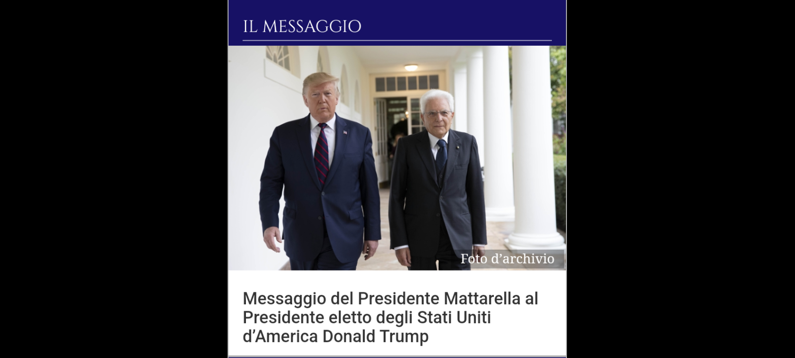 Ecco il testo redatto dal capo dello Stato italiano: «Le porgo cordiali auguri di successo nel suo nuovo mandato alla presidenza degli Stati Uniti d’America… i nostri Paesi sono uniti da inscindibili vincoli di amicizia e collaborazione, cementati dalla condivisione dei valori democratici e dalla comune adesione a un ordine internazionale fondato sulle regole».