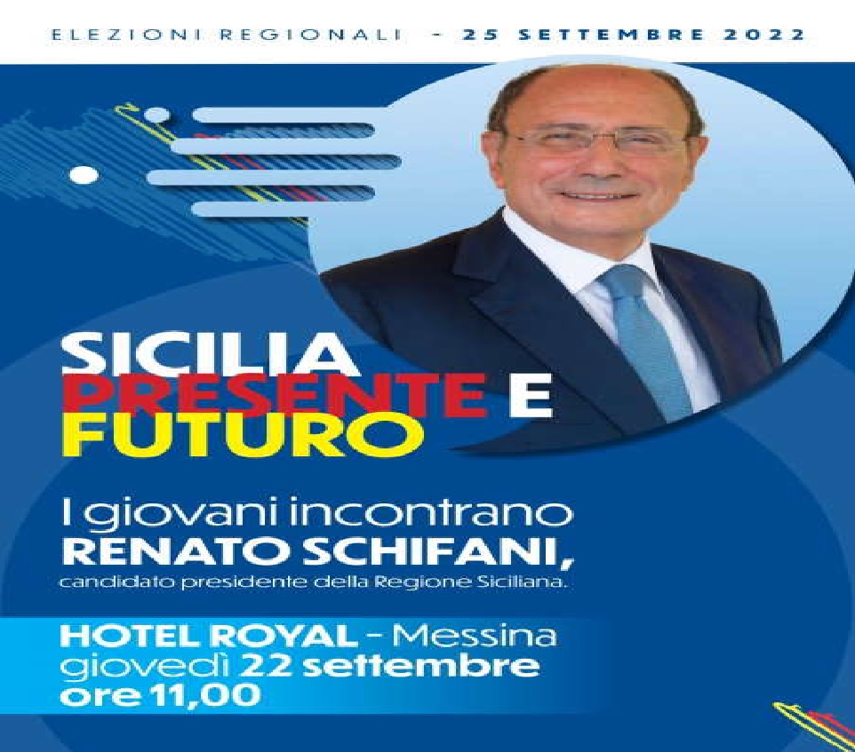 Il presidente Renato Schifani, candidato alla presidenza della Regione Siciliana, giovedì 22 settembre, alle ore 11, incontrerà una nutrita rappresentanza di giovani messinesi