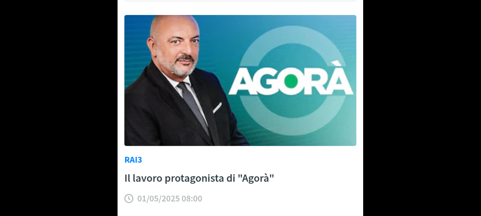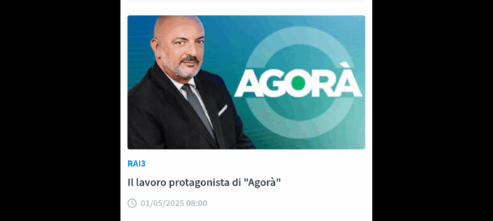 ‘Il Primo Maggio e i temi del lavoro; in occasione della ricorrenza della Festa dei Lavoratori, un dibattito sull’attuale situazione che riguarda la sicurezza sul lavoro con testimonianze e collegamenti, ma anche un punto sulla questione salariale… a seguire un’intervista a Fausto Bertinotti’. Sono questi i temi protagonisti della puntata di “Agorà”, che è iniziata in onda giovedì 1° maggio alle 8.00 su Rai3… con la conduzione di Roberto Inciocchi.