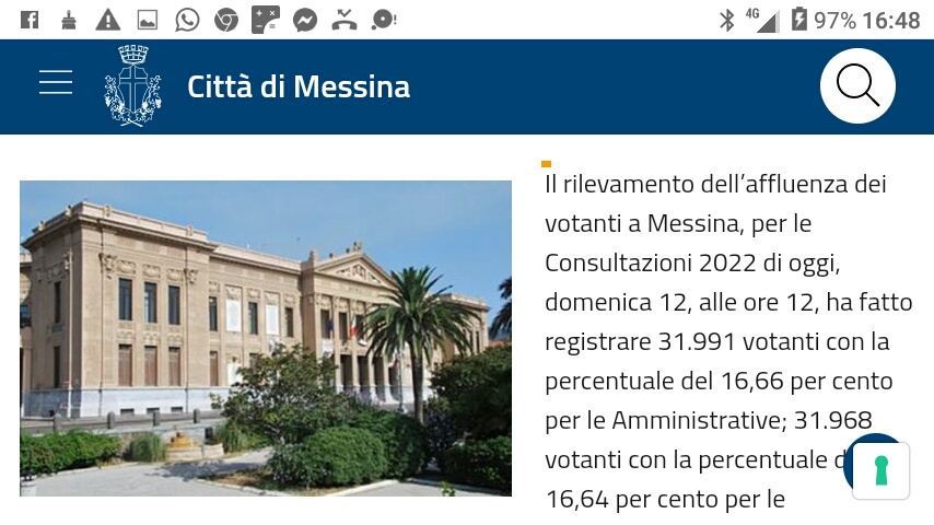 Il rilevamento dell’affluenza dei votanti a Messina, per le Consultazioni 2022 di oggi, domenica 12, alle ore 12, ha fatto registrare 31.991 votanti con la percentuale del 16,66 per cento per le Amministrative; 31.968 votanti con la percentuale del 16,64 per cento per le Circoscrizioni; 30.086 votanti per il Referendum Montemare (Area Montemare: 1.196 votanti con una percentuale del 17,85 per cento; Resto della Città: 28.890 votanti con una percentuale del 15,59 per cento); 28.686 votanti con la percentuale del 15,98 per cento per il Referendum nazionale n.1; 28.685 votanti con la percentuale del 15,98 per cento per il Referendum nazionale n.2; 28.683 votanti con la percentuale del 15,98 per cento per il Referendum nazionale n.3; 28.683 votanti con la percentuale del 15,98 per cento per il Referendum nazionale n.4; e 28.680 votanti con la percentuale del 15,98 per cento per il Referendum nazionale n.5.!