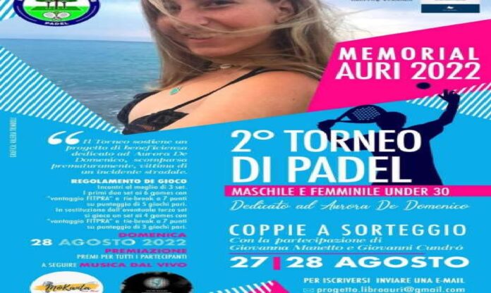 Il secondo Memorial “Aurora De Domenico”, torneo di padel disputato al circolo La Pineta ed intitolato alla giovanissima messinese vittima della strada, è stato vinto da Ludovico e Gianmaria Costa. I “Costa brother’s” hanno superato in finale la coppia composta da Chiara Santalco e Giorgia Vadalà Bertini (“Gin tonic”) con il punteggio di 6/2 6/4 mentre la finale per il 3. e 4. posto (giocata al meglio di un set) è stata vinta 13/11 al tie-break dalla la squadra “Scuderia Ferrari”, composta da Alberto De Domenico e Giulio D’Arrigo contro gli “A.S. Sintomatici” di Paulo Sergi e Giulio Muscarà.