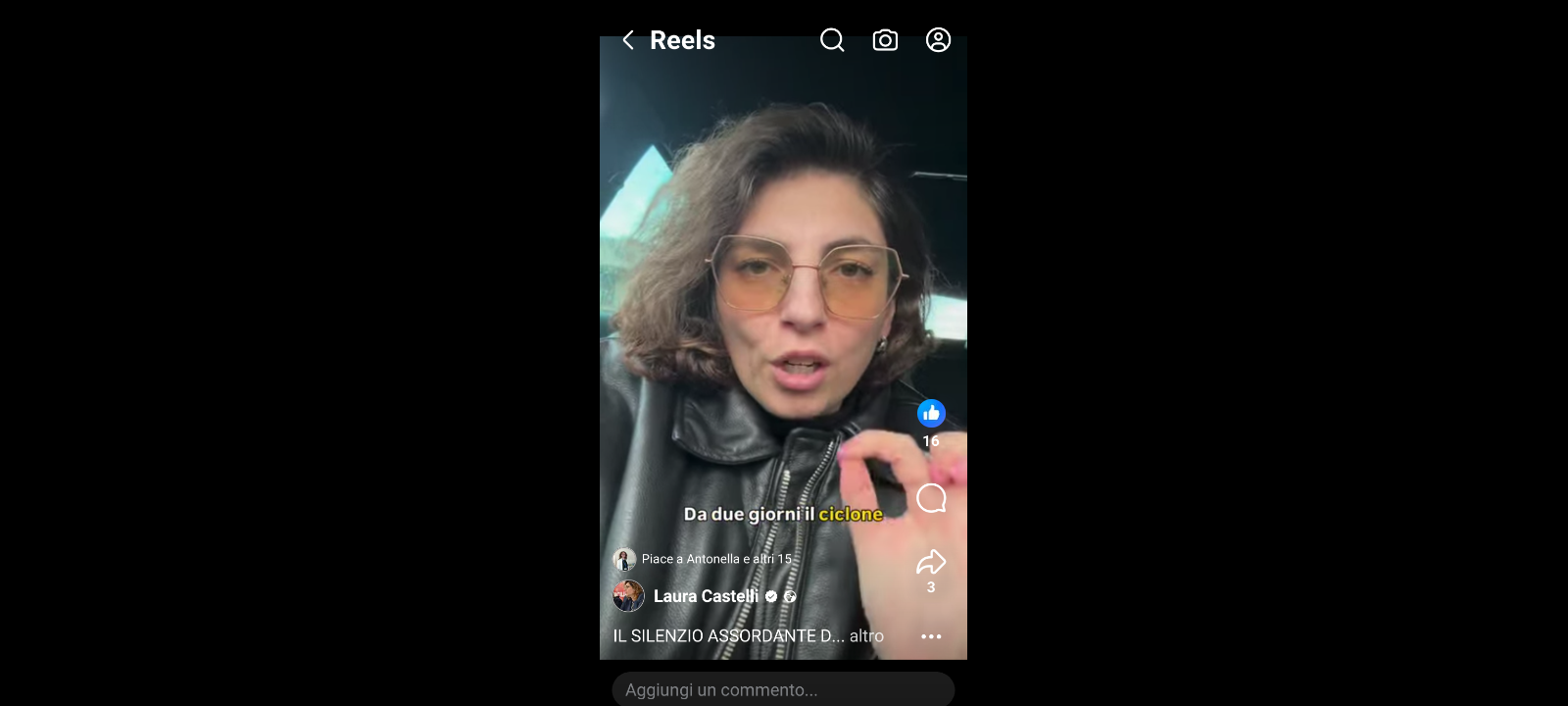 “Il Silenzio assordante dei media nazionali, davanti alla catastrofe che il ‘Ciclone Harry’ sta causando in Sicilia”. È questo il messaggio pubblicato poco prima delle ore 17.15 in un Post sulla propria Pagina Facebook, da Laura Castelli presidente del ‘Movimento Sud chiama Nord’, il Sodalizio fondato a maggio del 2022 dal sindaco di Taormina, Cateno De Luca.
