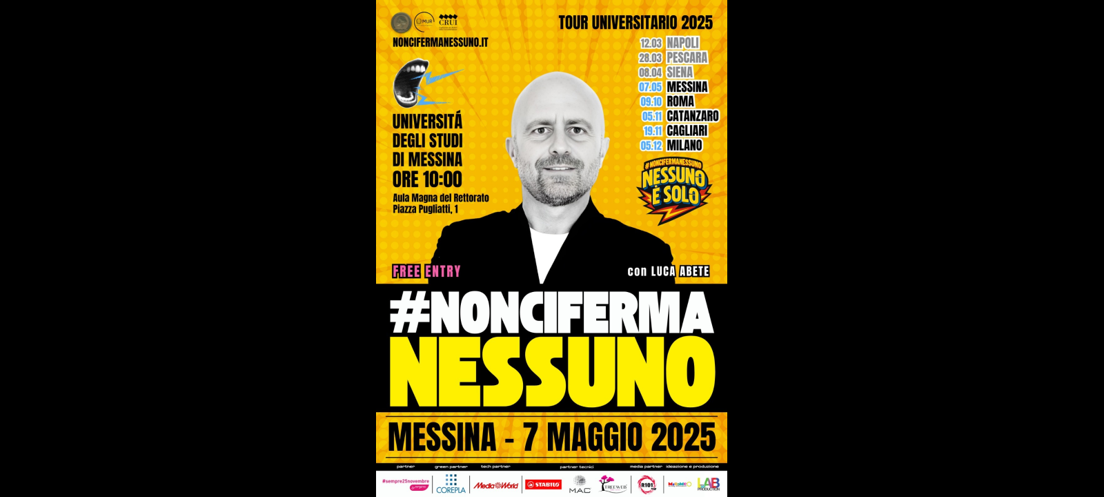 Il tour motivazionale ideato da Luca Abete #NonCiFermaNessuno torna a Messina: l’appuntamento è previsto per mercoledì 7 maggio, alle ore 10.00, presso l’Aula Magna del Rettorato dell’Università degli Studi di Messina – Piazza Pugliatti, 1.
