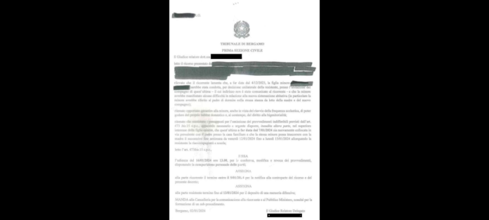 Così prosegue il testo: “siamo riusciti ad ottenere dal Tribunale di Bergamo un provvedimento urgente che dispone la collocazione prevalente della figlia presso il padre perché la madre continuava a disporre della minore disattendendo l’affido condiviso. Ecco il provvedimento”.