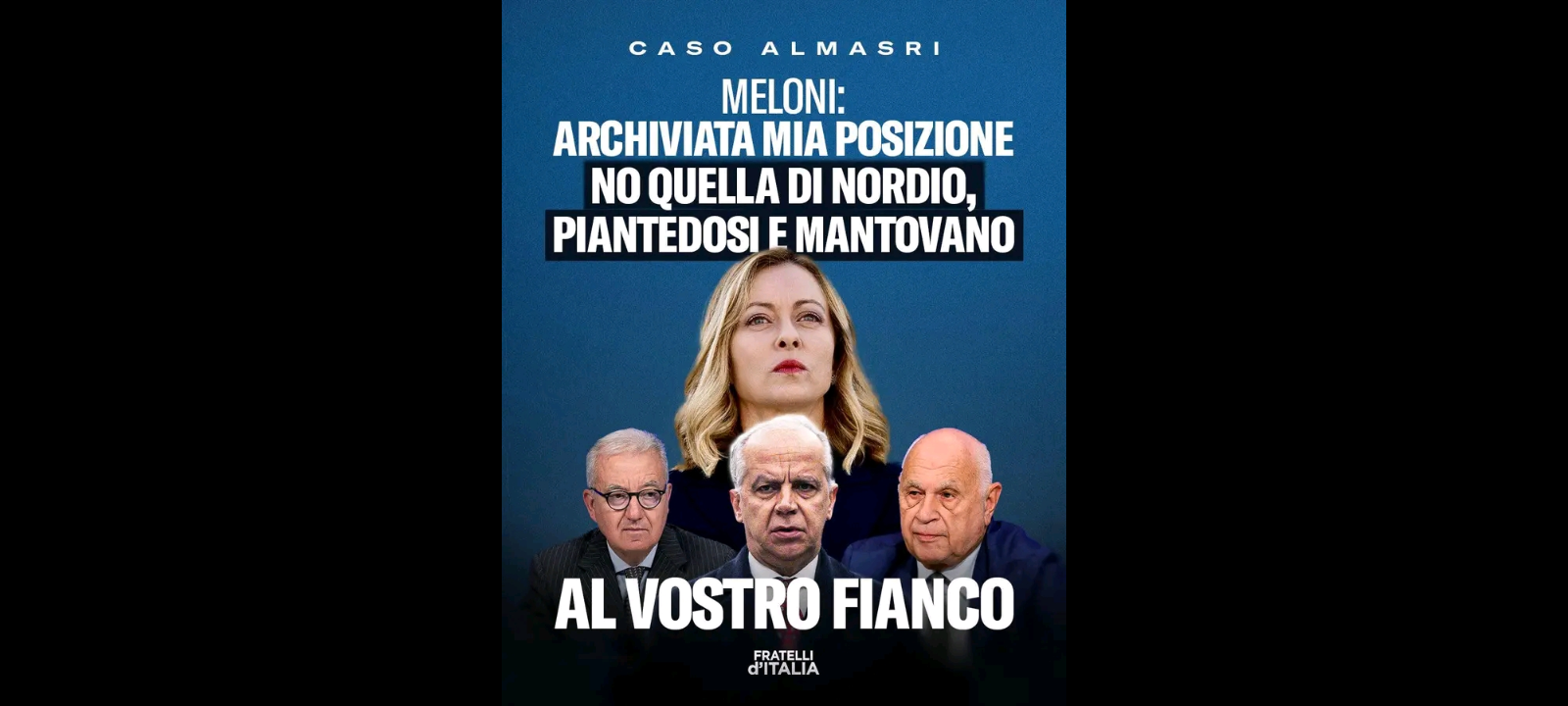 “Il Tribunale dei ministri ha disposto l’archiviazione della posizione del Presidente Meloni nel caso Almasri, mentre verrà chiesta l’autorizzazione a procedere nei confronti dei ministri Piantedosi, Nordio e del sottosegretario Mantovano”. Lo hanno scritto ieri, sulla loro omonima Pagina Facebook, i responsabili del Partito ‘Fratelli d’Italia’.