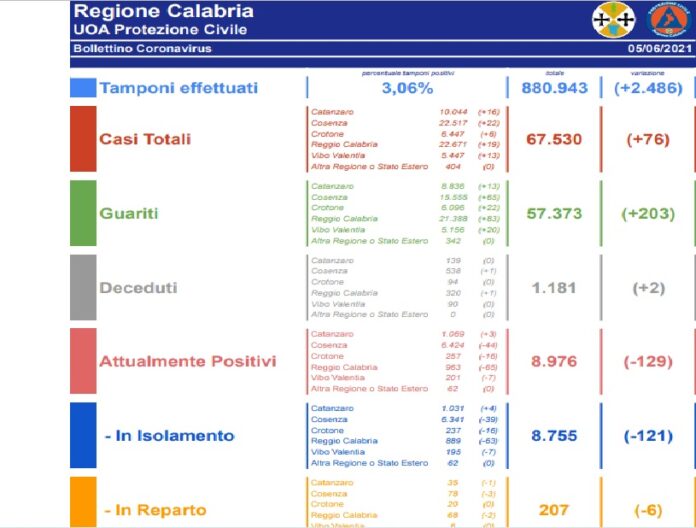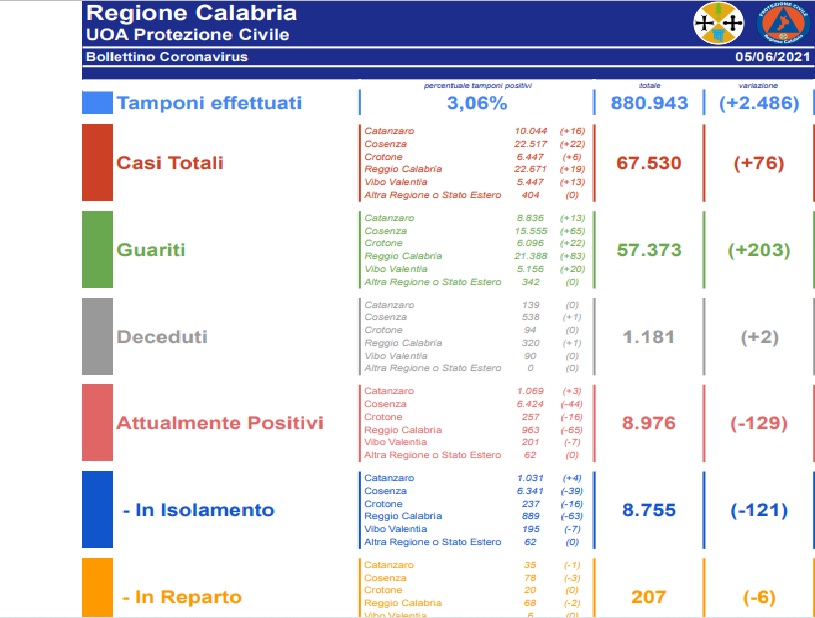 ECCO IL REPORT DELLA REGIONE CALABRIA, DI OGGI 5 GIUGNO 2021