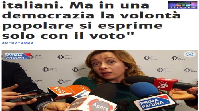 In attesa del voto di fiducia di questa sera al Senato dove l’interrogativo è puntato su due partiti che non hanno applaudito al discorso di Mario Draghi, ovvero il MoVimento 5 Stelle e la Lega, la leader di Fratelli d’Italia Giorgia Meloni non tarda a far sentire la sua voce e in un post sui social esprime tutto il suo dissenso verso la posizione presa da Mario Draghi nelle comunicazioni in Aula: “Draghi arriva in Parlamento e di fatto pretende pieni poteri, sostenendo che glielo hanno chiesto gli italiani. Ma in una democrazia la volontà popolare si esprime solo con il voto, non sulle piattaforme grilline o con gli appelli del PD. Sono le autocrazie che rivendicano di rappresentare il popolo senza bisogno di far votare i cittadini, non le democrazie occidentali. Fratelli d’Italia non intende assecondare questa pericolosa deriva. Decidano gli italiani del proprio futuro, non questo Parlamento delegittimato e impaurito. Elezioni subito”.