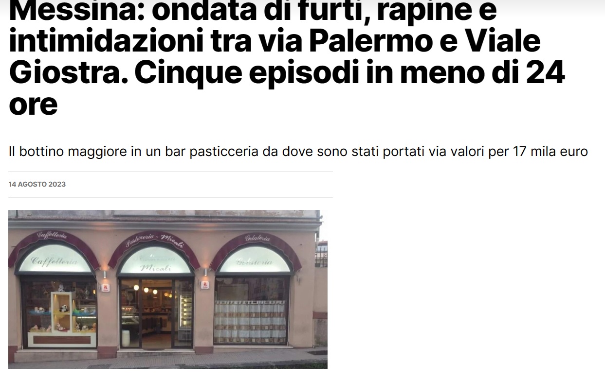 Il “colpaccio” al bar pasticceria Saccà di viale Giostra, dove i malviventi – nella notte – dopo essersi guadagnati l’ingresso da un buco, hanno portato via 7.000 euro di fondocassa e oltre 10.000 euro di Gratta e Vinci per poi darsi alla fuga facendo perdere le tracce. Nella giornata di ieri ad essere presa di mira una pasticceria all’altezza dell’Isolato 13 in via Palermo…, qui un malvivente armato di coltello ha portato via l’incasso per poi fuggire nei vicoli limitrofi. E inoltre stamani, poco dopo le 10, sul viale Giostra un malvivente armato di coltello si è fatto consegnare circa 700 euro contenuti nella cassa del Bar Pasticceria Micali per sparire forse atteso da un complice. Carabinieri e Polizia stanno ascoltando le vittime dei reati e acquisendo le immagini dei sistemi di videosorveglianza della zona per cercare di dare un nome e un volto ai malviventi.