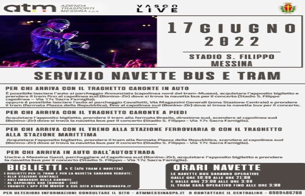 • per chi arriva con il traghetto Caronte&Tourist a piedi: potrà acquistare l’apposito biglietto al momento dello sbarco e quindi prendere il tram alla fermata Brasile, direzione sud, scendere al capolinea sud (Bonino-Zir) dove si trova la navetta bus per il concerto (Stadio S. Filippo – Via 17c Sacra Famiglia);