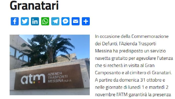 In occasione della Commemorazione dei Defunti, l’Azienda Trasporti Messina ha predisposto un servizio navetta gratuito per agevolare l’utenza che si recherà in visita al Gran Camposanto e al cimitero di Granatari.