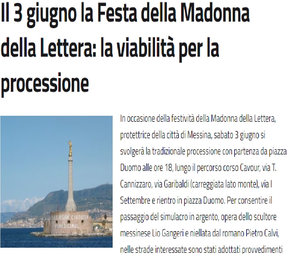 In occasione della festività della Madonna della Lettera, protettrice della città di Messina, sabato 3 giugno si svolgerà la tradizionale processione con partenza da piazza Duomo alle ore 18, lungo il percorso corso Cavour, via T. Cannizzaro, via Garibaldi (carreggiata lato monte), via I Settembre e rientro in piazza Duomo. Per consentire il passaggio del simulacro in argento, opera dello scultore messinese Lio Gangeri e niellata dal romano Pietro Calvi, nelle strade interessate sono stati adottati provvedimenti viabili.