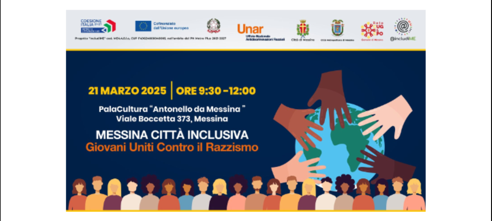 Anche a Messina oggi si celebra tale Giornata con un evento, alla presenza delle assessore alle Politiche giovanili e Pubblica istruzione Liana Cannata e alle Politiche sociali Alessandra Calafiore, dal titolo “Messina città inclusiva. Giovani uniti contro il razzismo” che è iniziata presso il Pala Cultura “Antonello da Messina”, a partire dalle ore 9.30, organizzato dal Comune di Messina in sinergia con la Città Metropolitana di Messina.
