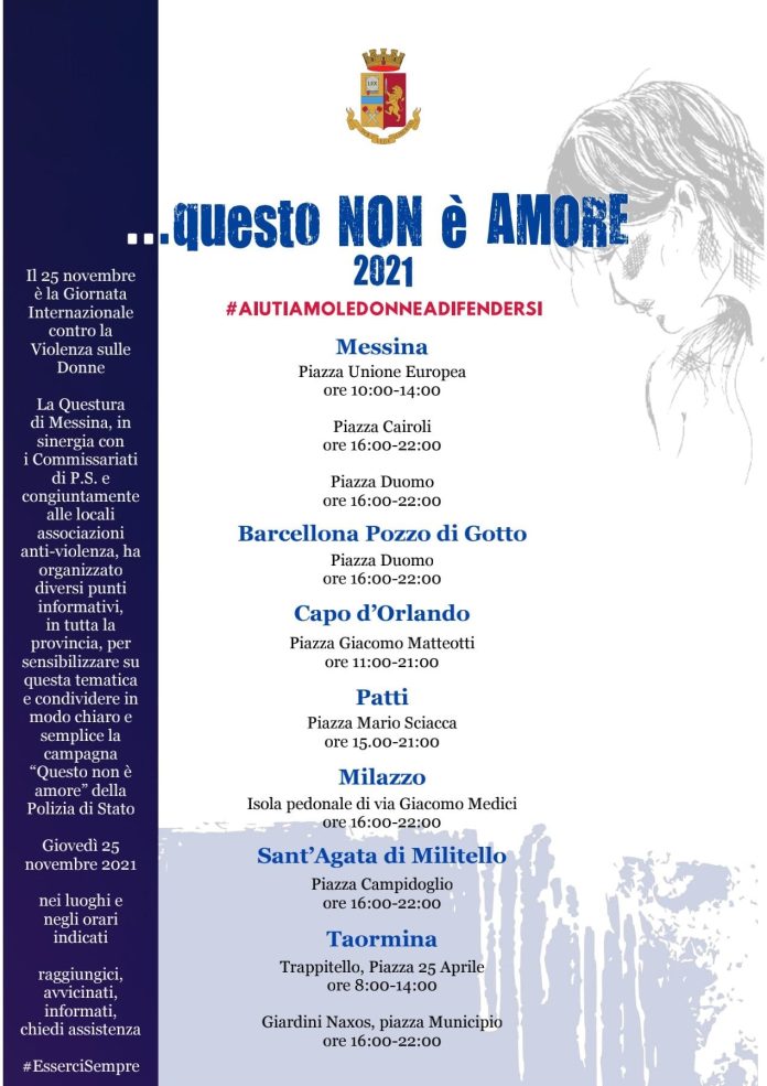 A Messina ed in ciascuna città sede di Commissariato di Pubblica Sicurezza, saranno presenti punti informativi presieduti da personale della Polizia di Stato, congiuntamente alle maggiori associazioni e centri anti-violenza presenti nel territorio. Presso ciascun punto verrà distribuita la nuova brochure della campagna “Questo non è amore” e saranno indicati i contatti utili per prevenire o contrastare ogni forma di violenza sulle donne.