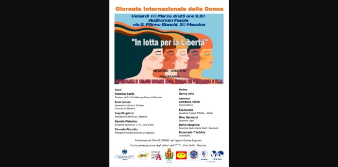 In occasione della ricorrenza della Giornata internazionale dei diritti della donna, domani, venerdì 10, alle ore 9.30, presso l’Auditorium Fasola in via S. Filippo Bianchi, patrocinato dal Comune di Messina, si terrà l’evento “In lotta per la Libertà”, che rappresenta un’occasione di riflessione con i giovani sulle discriminazioni e le violenze subìte dalle donne in ogni parte del mondo. Nello specifico l’attenzione sarà focalizzata sulla rivolta in atto che vede protagoniste le donne iraniane, attraverso una testimonianza diretta di una di loro, Samaneh Goudarzi… iraniana che da molti anni vive e lavora in Italia, dove esercita l’attività di odontoiatra.