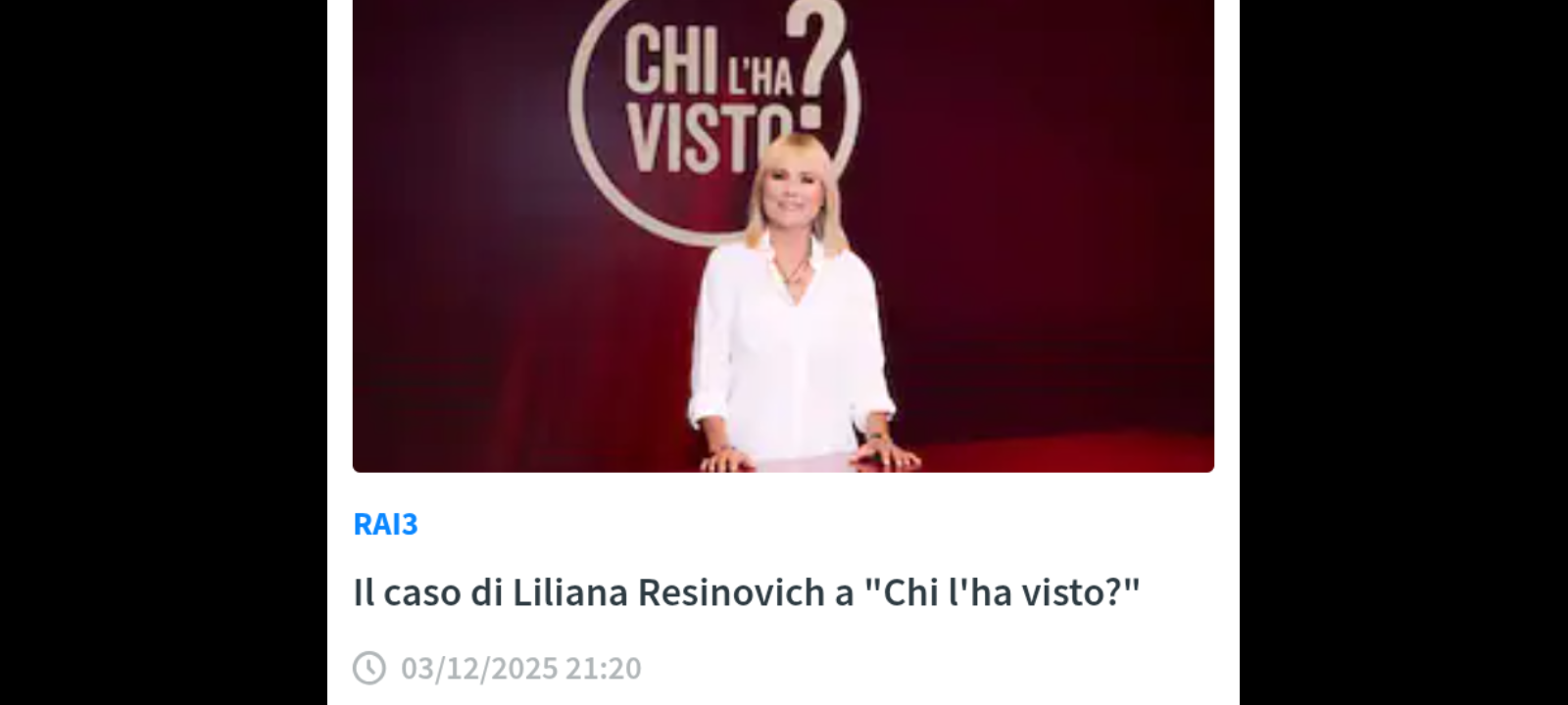 ‘In primo piano il caso di Liliana Resinovich che si arricchisce ciclicamente di inedite testimonianze. Liliana chiese dei sacchi neri a un ristoratore due anni prima della sua morte? Il fratello Sergio annuncia un esposto: “Ogni tanto qualcuno si fa avanti per avvalorare la tesi del suicidio – dice a Chi l’ha visto? -, ma per ora l’unico indagato resta il marito”’. È questo, uno degli argomenti della nuova puntata di “Chi l’ha visto?”, il programma condotto da Federica Sciarelli che è tornato in onda su Rai3 dopo le 21.20 del 3 dicembre 2025.