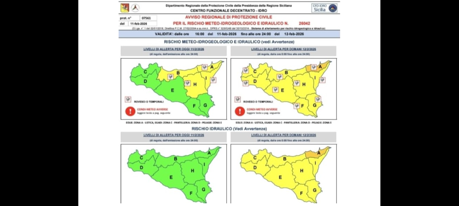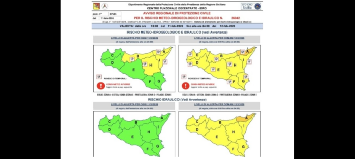 Tenuto conto del bollettino del Dipartimento Regionale di Protezione Civile, che prevede raffiche di vento da forti a burrasca dai quadranti occidentali, possibili mareggiate lungo le coste esposte e piogge sparse anche a carattere di rovescio, il Sindaco Federico Basile, con Ordinanza n. 28 del 11 febbraio 2026, ha disposto: