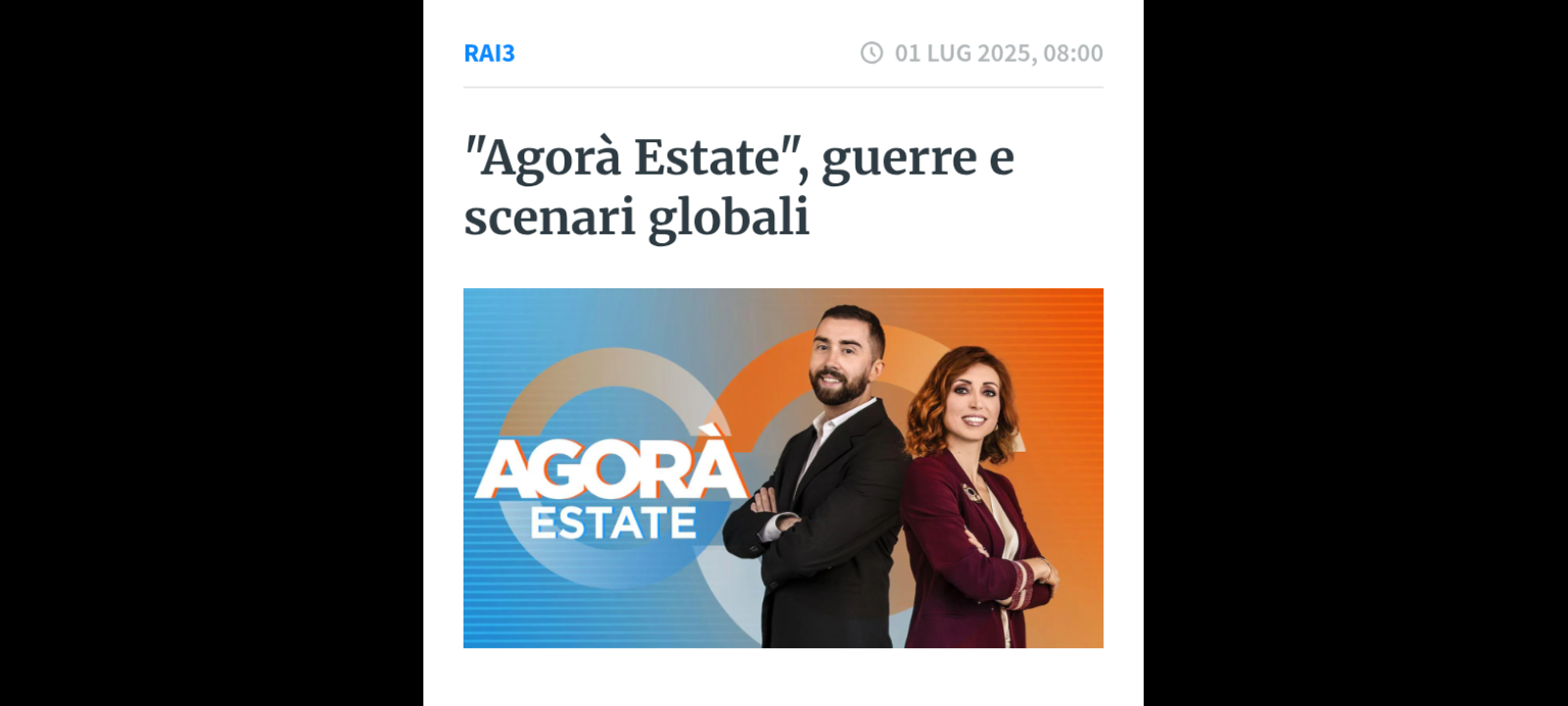 ‘In Ucraina si continua a combattere: nuove offensive sul fronte orientale aggravano una guerra sempre più logorante; in Medio Oriente si riaccende il negoziato per una possibile tregua a Gaza; negli Stati Uniti l’effetto Trump scuote i mercati e il dollaro scivola ai minimi storici; e poi il caldo estremo in tutta Europa e le preoccupazioni per l’attività sismica dei Campi Flegrei; infine, la politica interna, con la discussione sui dazi, spesa militare e gestione dei flussi migratori’. Questi i principali temi della puntata di “Agorà Estate”, in onda martedì 1° luglio, alle 8.00 su Rai3, condotta da Giulia Di Stefano con Marco Carrara.