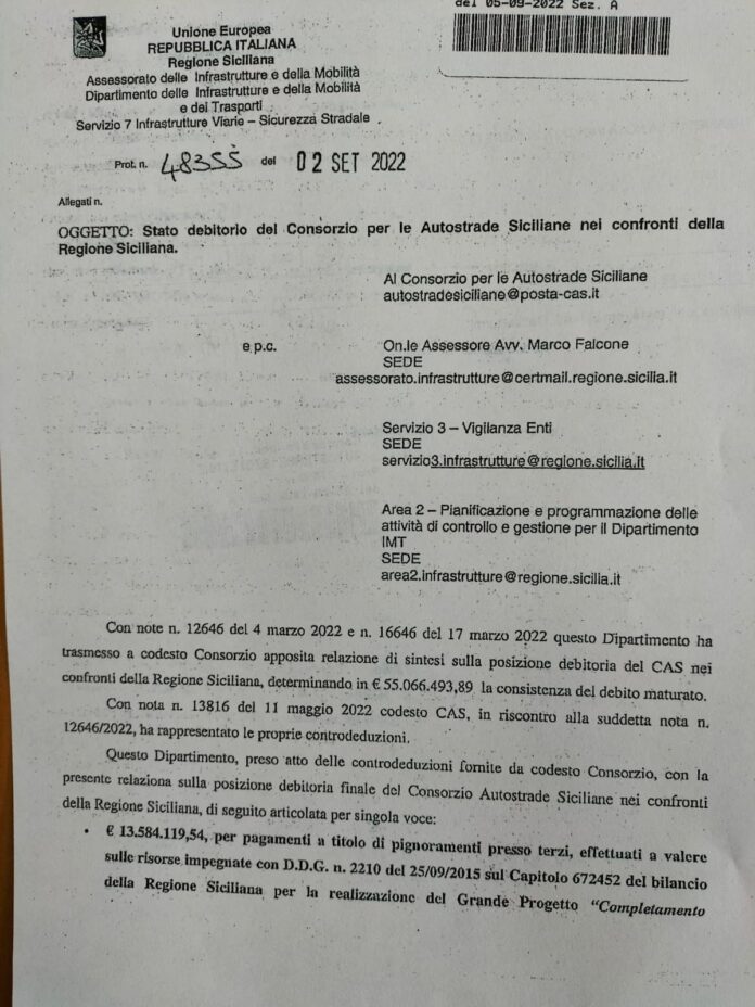 “In una nota datata 2 settembre 2022, a firma del dirigente del Dipartimento regionale delle Infrastrutture e della Mobilità, Fulvio Bellomo, viene messo nero su bianco lo stato debitorio del Consorzio per le Autostrade siciliane nei confronti della Regione”