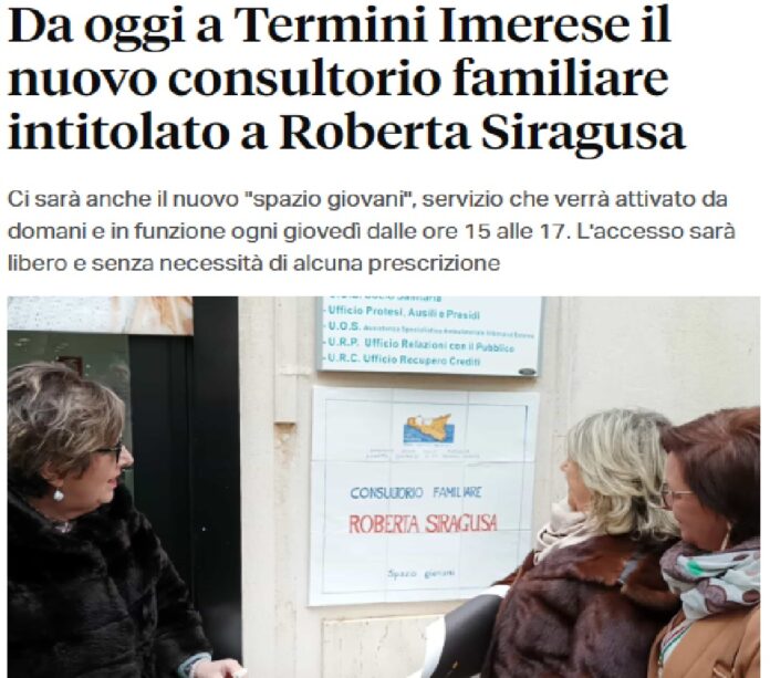 Nello spazio antistante il consultorio è stata scoperta una targa con l‘intitolazione della struttura a Roberta Siragusa. A promuovere l’iniziativa sono state l’Avo Sicilia insieme alle sezioni di Palermo guidata da Andrea Monteleone e Termini Imerese con il suo presidente Patrizia Notaro, oltre alla Rete regionale Zeromolestie Sinalp.
