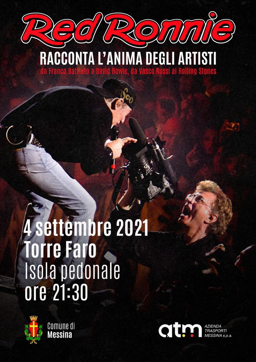 De Luca ha aggiunto e concluso: “sabato 4 settembre dalle 21.30 nel borgo marinaro di Torre Faro in piazza, -Red Ronnie racconta l’anima degli artisti. Da Franco Battiato e David Bowie, Da Vasco Rossi ai Rolling Stones- dove mostrerò anche video rari o inediti”.