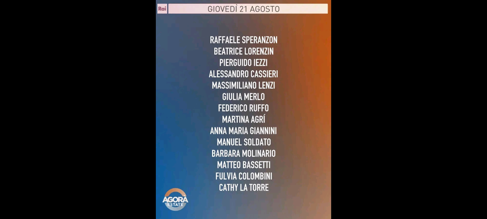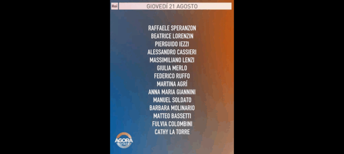 ‘Israele approva l’insediamento che divide in due la Cisgiordania; Trump si dice ottimista su una pace tra Russia e Ucraina, ma la strada per il bilaterale Putin-Zelensky è ancora in salita; scoppia il caso sull’azzeramento della Commissione vaccini mentre la politica scalda i motori e prepara le squadre per le prossime elezioni regionali; video intimi rubati a Stefano De Martino e divulgati in rete: si indaga per accesso abusivo; l’estate per gli anziani: tra solitudine e carenza di assistenza sanitaria’. Questi alcuni dei temi della puntata di “Agorà Estate”, condotto da Giulia Di Stefano con Marco Carrara, che è iniziata in onda giovedì 21 agosto alle 8.00 su Rai3.