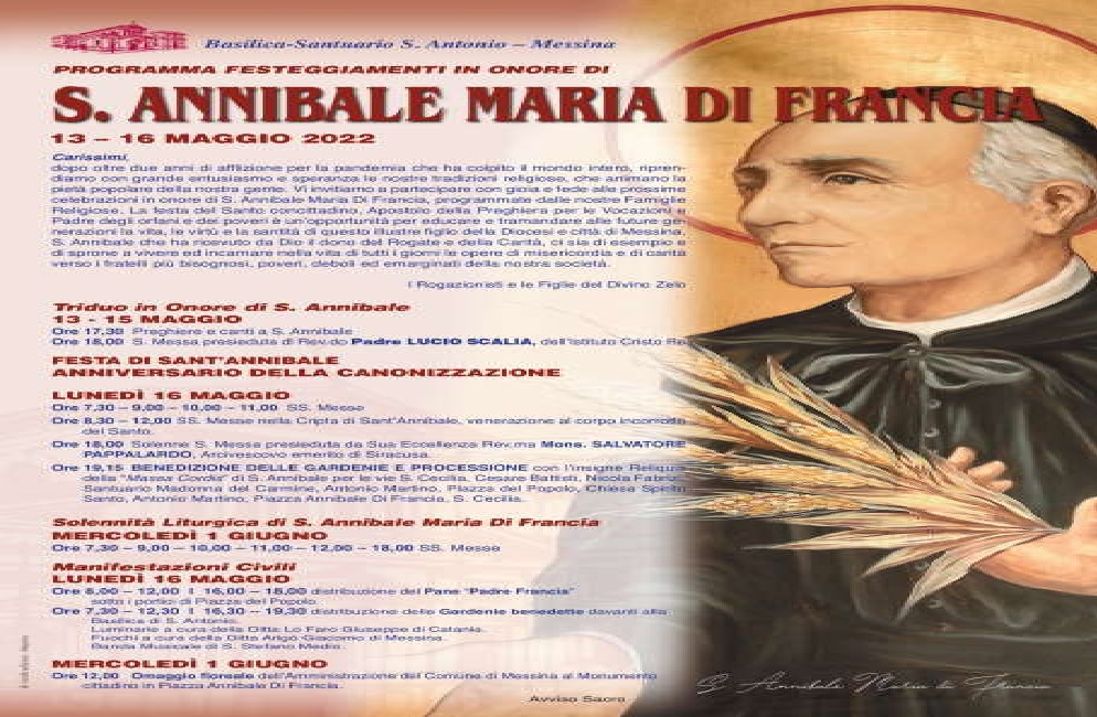 Lunedì 16 maggio festa di S. Annibale durante la giornata si susseguiranno diverse SS. Messe sia in Basilica che in Cripta dove riposano le spoglie mortali di S. Annibale. Alle ore 12 S. Messa nella Cripta di S. Annibale e omaggio al corpo incorrotto del Santo. Alle ore 18 solenne S. Messa presieduta da Sua Ecc.za Mons. Salvatore PAPPALARDO, Arcivescovo emerito di Siracusa. Atto di Affidamento delle Confraternite al Santo messinese. Subito dopo la S. Messa sulla Via S. Cecilia saranno benedette le Gardenie a ricordo del miracolo compiuto da S. Annibale ad un fioraio della città e si avvierà la PROCESSIONE del Santo con le sue reliquie per le vie Cesare Battisti, Nicola Fabrizi, Santuario Madonna del Carmine, Antonio Martino, Piazza del Popolo, Chiesa Spirito Santo, Antonio Martino, Piazza Annibale Di Francia, S. Cecilia.