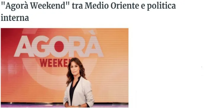 ‘La guerra in Medio Oriente, con l’escalation della tensione tra Israele, Libano e Iran; l’allarme a Roma per la manifestazione pro Palestina in programma sabato 5 ottobre, a due giorni dal primo anniversario dell’attacco di Hamas in Israele, nonostante il divieto della Questura; e poi la politica interna con la manovra economica’. Sono questi i principali temi della puntata di sabato 5 ottobre di Agorà Weekend, che è iniziata in onda alle 8.00 su Rai 3.