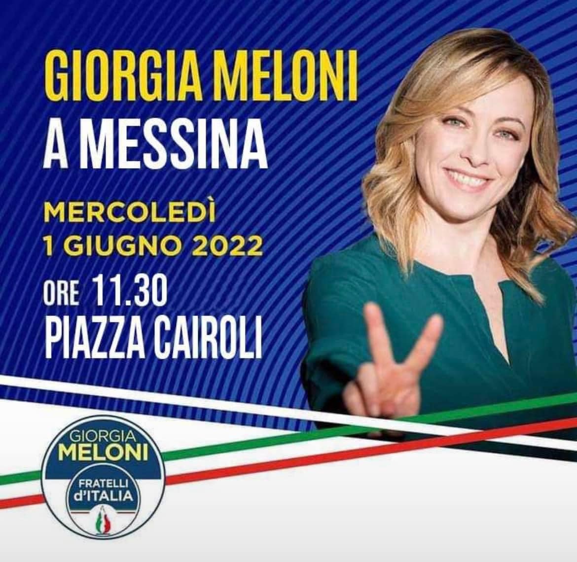 La leader di Fratelli d’Italia, Giorgia Meloni, che con il suo Partito sostiene il candidato sindaco del centrodestra Maurizio Croce (il quale si presenterà alle Elezioni del 12 giugno 2022) il prossimo mercoledì 1 sarà a Messina.