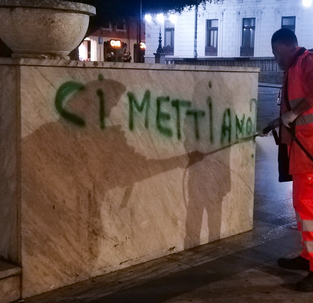Falcomatà ha specificato: “nella notte le scritte sono già state ripulite con l’intervento di Castore e Avr, naturalmente con un costo per la collettività che ci saremmo volentieri risparmiati. Ovviamente la piazza è piena di telecamere ed il responsabile sarà presto individuato. Tra l’altro la proposta fatta così -ci mettiamo?- non si sentiva da qualche decennio. E nell’epoca di instagram e tiktok vai a scriverla su un monumento? Non ti meravigliare se ti ha detto no”!