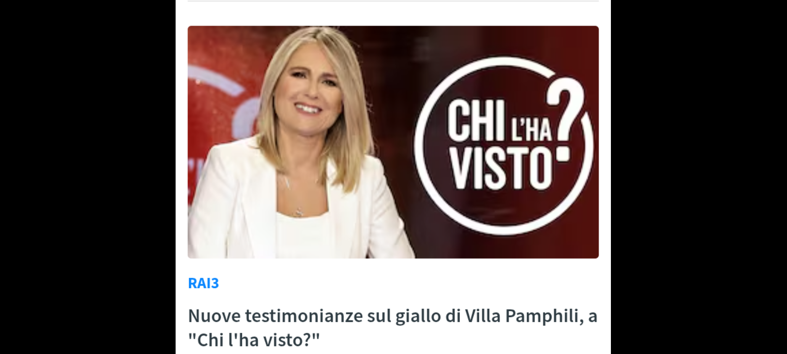 - ‘”Chi l’ha visto?” proporrà testimonianze inedite di quei giorni a Roma; e ancora, la morte di Chiara Poggi: si analizzano tracce e impronte che non erano state considerate importanti nelle prime indagini. E riaprendo i reperti si è trovato anche un capello. Dal telefono sporco di sangue sotto la cornetta ai contenitori di fruttolo, tutto al microscopio per vedere se c’erano più persone nella villetta la mattina dell’omicidio; la puntata prosegue con un altro caso: Riccardo ha lasciato la sua auto sulla diga del Furlo (Pesaro Urbino) ed è scomparso. Ma le ricerche nella diga non hanno trovato nessuna traccia. E ora, analizzando il suo computer sono state trovate ricerche su viaggi a Dublino e altre città europee: Riccardo potrebbe aver deciso di troncare con tutti e ricostruirsi una vita all’estero?’;