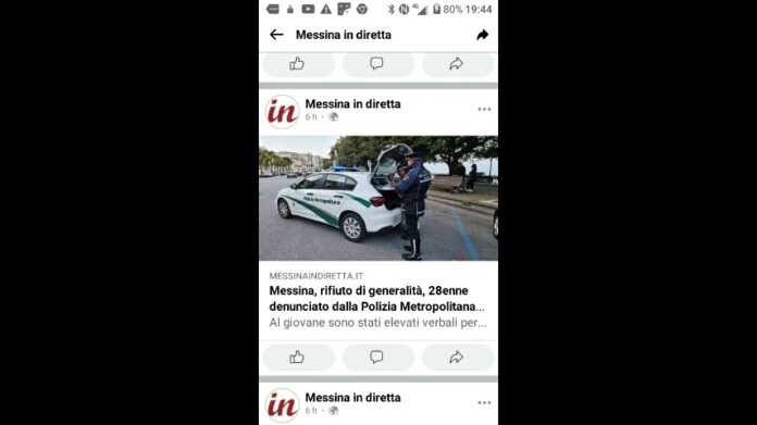 La Polizia Metropolitana di Messina ha denunciato all’Autorità giudiziaria, in stato di libertà, un ventottenne che si è rifiutato di fornire i propri dati identificativi, nel corso di un’operazione di notifica di un verbale per violazione delle norme del codice della strada