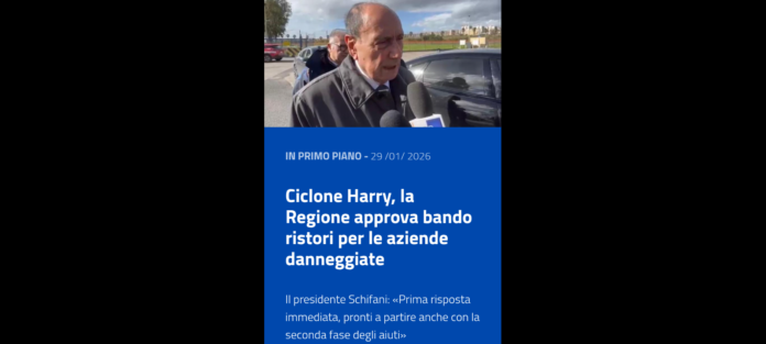 La Regione è pronta a partire con i primi aiuti economici alle imprese siciliane colpite dal ciclone Harry: il governo Schifani, infatti, ha approvato questa mattina, nel corso della seduta di giunta, il bando con il quale sarà assegnato un contributo minimo di 5 mila euro a fondo perduto per riattivare le attività economiche ferme a causa del maltempo.
