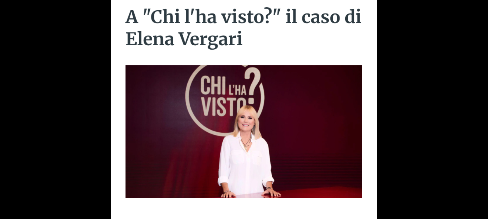 ‘La scomparsa di Elena Vergari: una lettera anonima indica dove sarebbe stata occultata… la mamma di Ladispoli non si sarebbe allontanata in compagnia di un uomo con la Mercedes, ma sarebbe stata uccisa; e poi la scomparsa di Nicola: fa vedere a tutto il paese le foto di una giovane e bella donna. È caduto in una trappola? È da metà agosto che nessuno ha più sue notizie; “Sono una accumulatrice seriale” dice a “Chi l’ha visto?” la donna che ha causato disagio ai condomini costretti a convivere con sacchi di spazzatura… il programma di Rai3 aveva risposto alla richiesta di aiuto da parte di alcuni cittadini con una diretta mercoledì scorso… e ora si cerca di risolvere il problema’