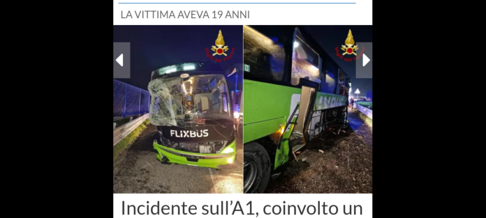 La scorsa notte, intorno alle 3, sull’A1, c’è stato un incidente che ha coinvolto un pullman Flixbus, tra Modena Sud e Valsamoggia, al chilometro 174, in direzione Sud. Nel descritto impatto…, sono rimasti coinvolti un congolese di 19 anni…, purtroppo deceduto… ed un ferito di 58 anni che è stato portato all’ospedale Maggiore di Bologna dove è ricoverato in rianimazione, prognosi riservata.
