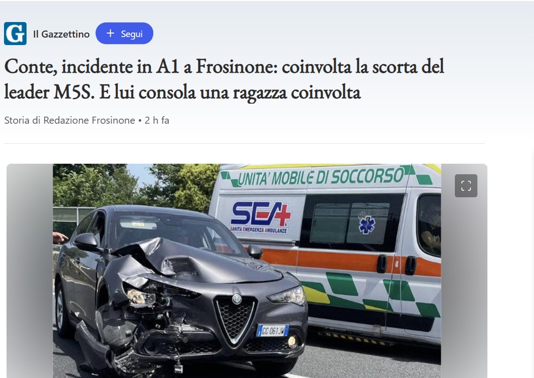 La scorta di Giuseppe Conte è rimasta coinvolta in un incidente in autostrada nella tarda mattinata di oggi, 21 giugnio, tra i caselli di Frosinone e Ceprano. Per fortuna non ci sono stati feriti gravi. Solo ripercussioni alla circolazione autostradale, per i rilievi sono intervenuti gli agenti della polizia stradale di Frosinone, diretti dal vice questore aggiunto Stefano Macarra.