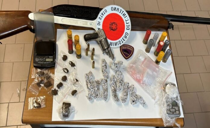 Gli agenti di una volante si sono portati nello stabile per effettuare un controllo nei confronti di un soggetto sottoposto al regime posto agli arresti domiciliari. Nel percorrere la tromba delle scale, l’attenzione del personale operante è stata attirata da una intercapedine prossima al vano ascensore, dove una approfondita verifica ha consentito di rilevare la presenza di un bilancino di precisione, nonché di diversi involucri di stupefacenti, pronti per lo smercio… 48 grammi di hashish, 22 grammi di marjuana, 9 grammi di cocaina. Il controllo è stato esteso al resto delle parti comuni dell’edificio, e in particolare al tetto, dove, all’interno di un vano, sono state trovate armi e munizioni… un fucile semiautomatico cal. 12 di provenienza furtiva, una pistola revolver cal. 32 long, 5 cartucce cal. 38 e 12 cartucce cal. 12.