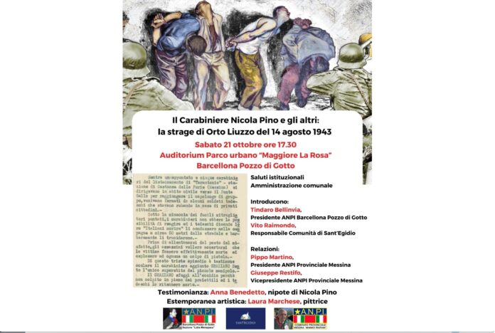 Quando questi si accorsero che i soldati tedeschi, in ritirata verso Messina, volevano saccheggiare una villa di Orto Liuzzo, andarono in soccorso di Stefano Giacobbe, che cercava di difendere la stessa villa. Ma furono disarmati dai tedeschi e subito dopo, nella notte prima di mezz’agosto, fucilati. Solo Graziano riuscì a scampare, diventando testimone vivente dell’eccidio. Dopo i saluti istituzionali dell’Amministrazione comunale, sabato 21, prenderanno la parola Tindaro Bellinvia, presidente Anpi Barcellona Pozzo di Gotto, e Vito Raimondo, responsabile della Comunità di S. Egidio. Seguiranno le relazioni di Pippo Martino e Giuseppe Restifo, rispettivamente presidente e vice-presidente dell’Anpi provinciale di Messina. Sicuramente la testimonianza più toccante sarà poi quella di Anna Benedetto, nipote di Nicola Pino. Concluderà un’estemporanea artistica di Laura Marchese, pittrice.