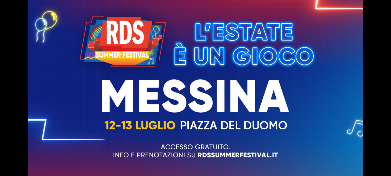I prossimi appuntamenti di RDS Summer Festival… Palmi il 19 e 20 luglio e l’ultima tappa a Rimini il 26 e 27 luglio. Si ringraziano le aziende sponsor del progetto… Coca-Cola, Galbani, Enel, Avon, Pasta Garofalo. Si ringrazia Fiat Sciotto Automobili, partner della tappa di Messina. Con la partecipazione di Poste Italiane. Si ringrazia anche Corriere della Sera, media partner dell’evento. In allegato la locandina della tappa.