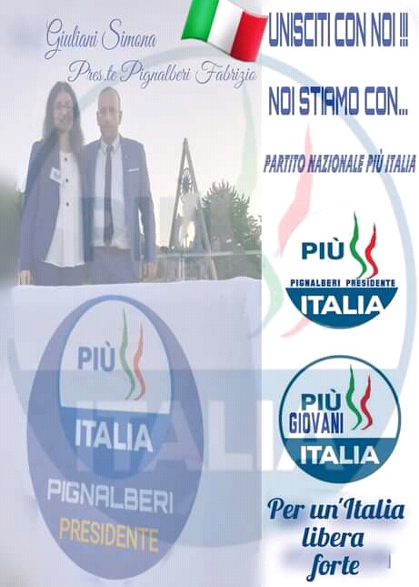 Ha evidenziato la Giuliani: “grazie all’impegno profuso in questi anni e alla fiducia che il Presidente Nazionale Fabrizio Pignalberi ha voluto riporre in me, mi pregio di aver fondato, insieme a lui, il Partito Piu’ Italia, con l’ambizione di costruire un’Italia libera e forte. Libera e forte, aggettivi che in questo momento storico vacillano più che mai”.