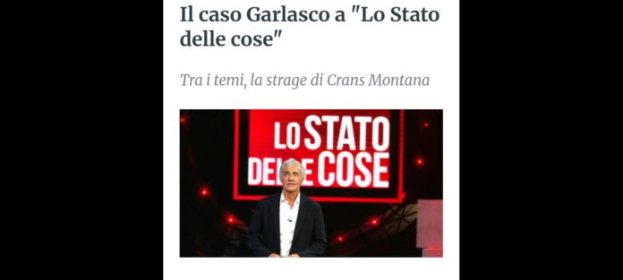‘“La versione di Michele Santoro” come sempre sarà dedicata ai fatti nazionali e internazionali più importanti; e poi nuovi colpi di scena per il caso Garlasco: ora al centro del dibattito c’è la porta a soffietto di casa Poggi, quella che conduce in cantina e che l’assassino deve aver sicuramente aperto: perché non presenta impronte di Alberto Stasi? Partecipano oltre al Direttore di Gente Umberto Brindani, l’ex Comandante dei Ris Luciano Garofano e l’avvocato di Stasi Antonio De Rensis, anche il genetista Ugo Ricci e il magistrato Stefano Vitelli che assolse Stasi in primo grado’. È tornato il consueto appuntamento con “Lo Stato delle Cose” il programma di attualità e approfondimento di Massimo Giletti, che è iniziato in onda il 16 febbraio alle 21.20 su Rai3.