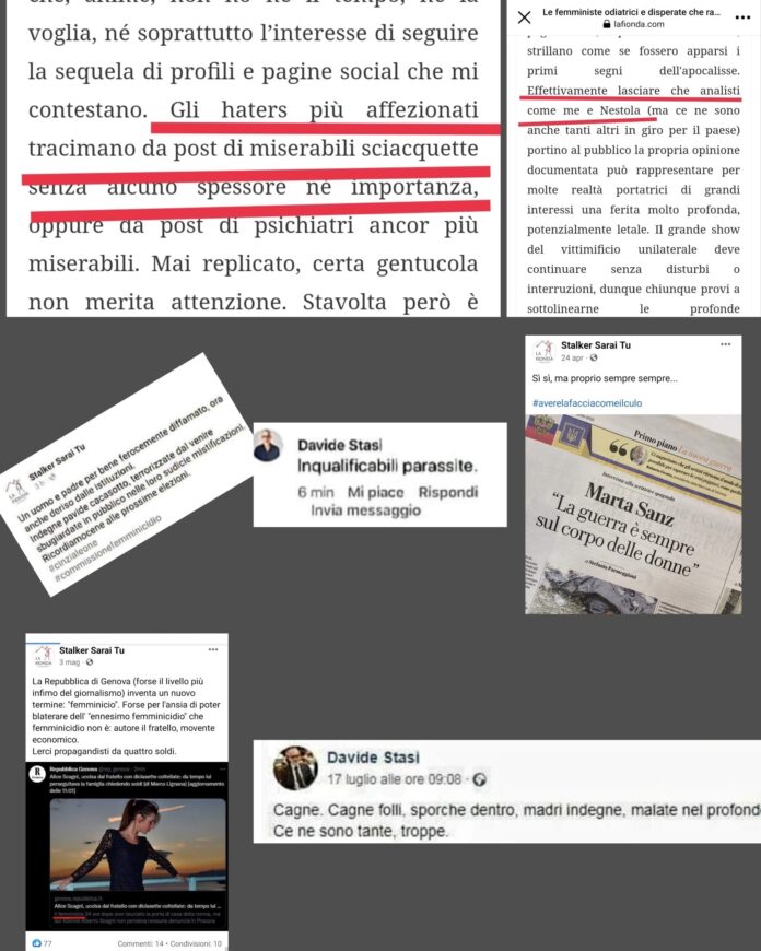 • chiamare in audizione 2 blogger senza alcuna formazione relativa al tema che si affronta in Parlamento, senza competenze tecniche a riguardo, ma che estrapolano dati e ne relazionano una loro personale interpretazione, nel mentre decine di donne in Italia vengono uccise da uomini violenti, gelosi, possessivi, per non parlare di quelle innumerevoli donne maltrattate violentate, stuprate, è di una gravità inaudita. Un tentativo di audire uno di questi blogger, rappresentanti del gruppo “Stalker sarai tu” o “La fionda”, era stato fatto anche alla Camera dei deputati durante i lavori in commissione Giustizia sui testi relativi all’affido dei minorenni e alle conseguenti modifiche di diversi art. del Codice Civile e della Legge 54/2006;