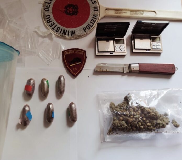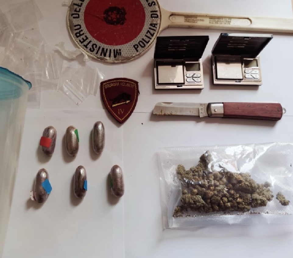 All’interno, è stato rinvenuto lo stupefacente, per complessivi grammi 64 di hashish e grammi 24 di marjuana, due bilancini elettronici di precisione, un coltello utilizzato per tagliare l’hashish e materiale per il confezionamento delle dosi.
