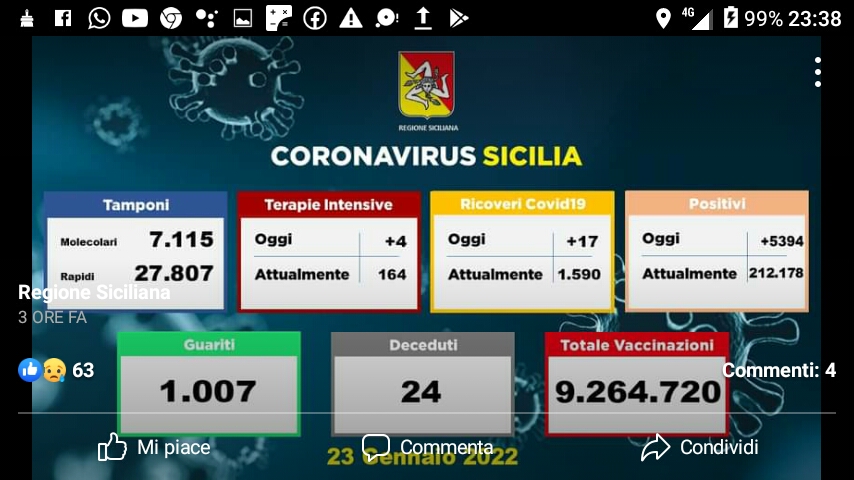 È QUESTO QUANTO SI È VERIFICATO OGGI 23 GENNAIO 2022, SUL #CORONAVIRUS IN #SICILIA