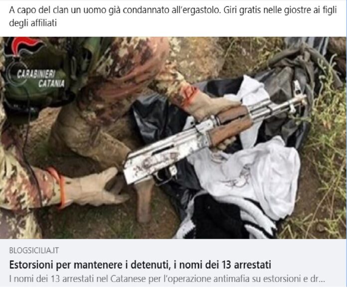 Biglietti per giri gratis sulle giostre ai figli degli affiliati detenuti: era uno dei modi di pagare il ‘pizzo’ a un clan di Biancavilla emerso dall’inchiesta “Ultimo atto” della Dda della Procura di Catania. Le indagini dei carabinieri, oltre 100 militari hanno eseguito il provvedimento nelle province del capoluogo etneo e de L’Aquila. I reati ipotizzati, a vario titolo, sono associazione mafiosa, estorsione, associazione a delinquere finalizzata al traffico di stupefacenti, reati aggravati dal metodo mafioso.