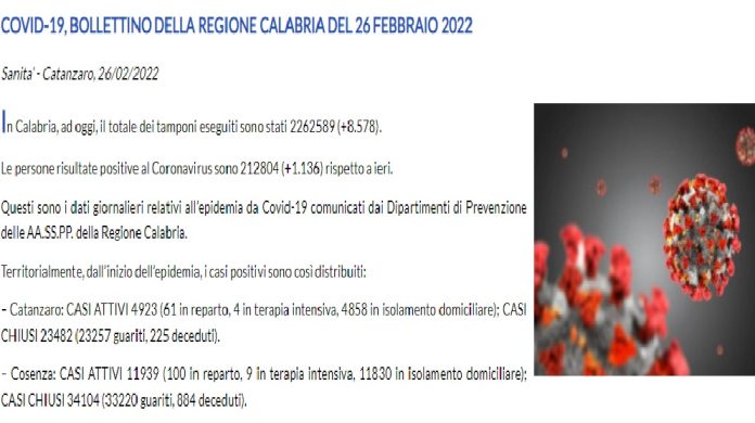 In Calabria, ad oggi, il totale dei tamponi eseguiti sono stati 2262589 (+8.578). Le persone risultate positive al Coronavirus sono 212804 (+1.136) rispetto a ieri.