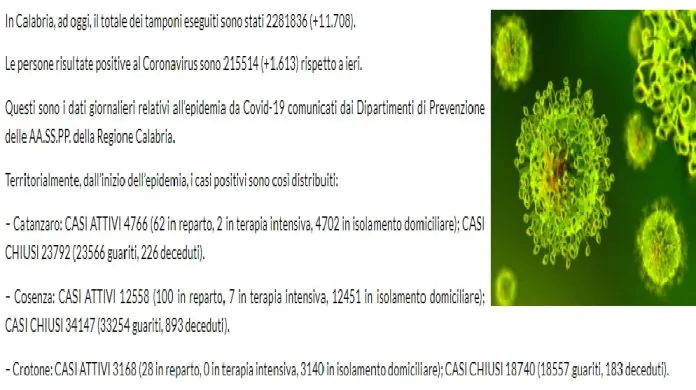In Calabria, ad oggi, il totale dei tamponi eseguiti sono stati 2281836 (+11.708). Le persone risultate positive al Coronavirus sono 215514 (+1.613) rispetto a ieri.