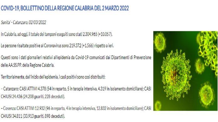 – Reggio Calabria: CASI ATTIVI 12.766 (90 in reparto, 8 in terapia intensiva, 12.668 in isolamento domiciliare); CASI CHIUSI 79.526 (78.895 guariti, 631 deceduti);