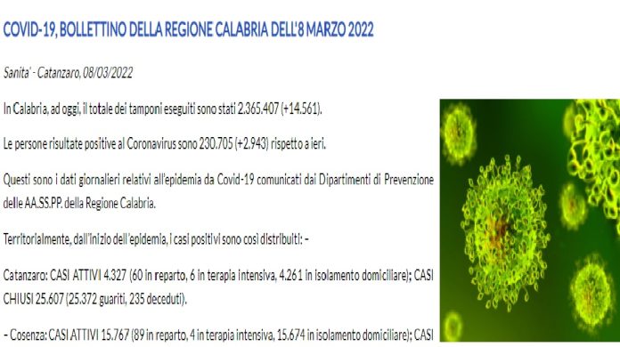 In Calabria, ad oggi, il totale dei tamponi eseguiti sono stati 2.365.407 (+14.561). Le persone risultate positive al Coronavirus sono 230.705 (+2.943) rispetto a ieri.