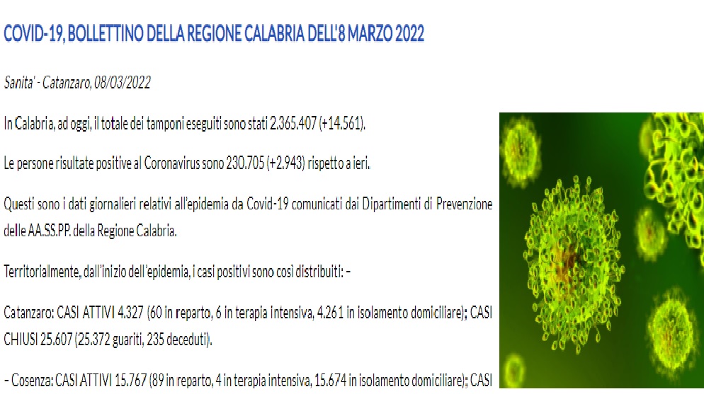 – Cosenza: CASI ATTIVI 15.767 (89 in reparto, 4 in terapia intensiva, 15.674 in isolamento domiciliare); CASI CHIUSI 35.796 (34.876 guariti, 920 deceduti);